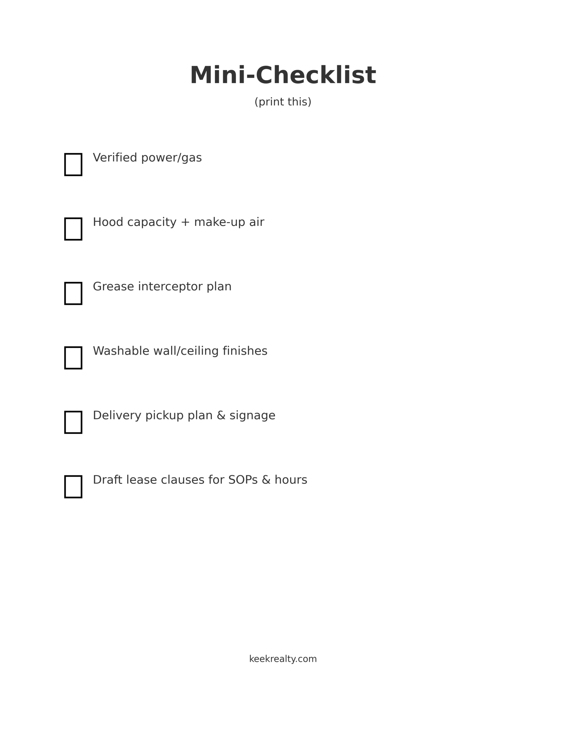 - Weeks 1–2: site screen + city pre-meet; confirm vent/grease path.